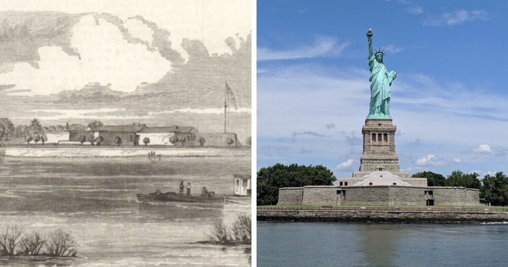 3. Остров Свободы (тогда остров Бедлоус) в Нью-Йорке до и после строительства статуи Свободы
