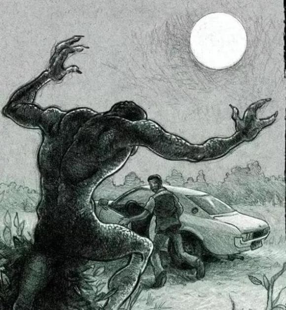 Когда парень остановил машину, то услышал позади себя странные звуки. Обернувшись, он увидел, что к нему приближается нечто, похожее на гигантскую ящерицу. По его словам, оно хотело поднять машину и вскочило на её крышу, пока он пытался уехать. Дэвис свернул на другую сторону дороги, чтобы сбросить нападавшего.
