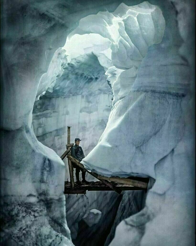 Мост, соединяющий тоннели, проложенные внутри ледника Мармолада, 1917 год