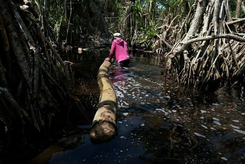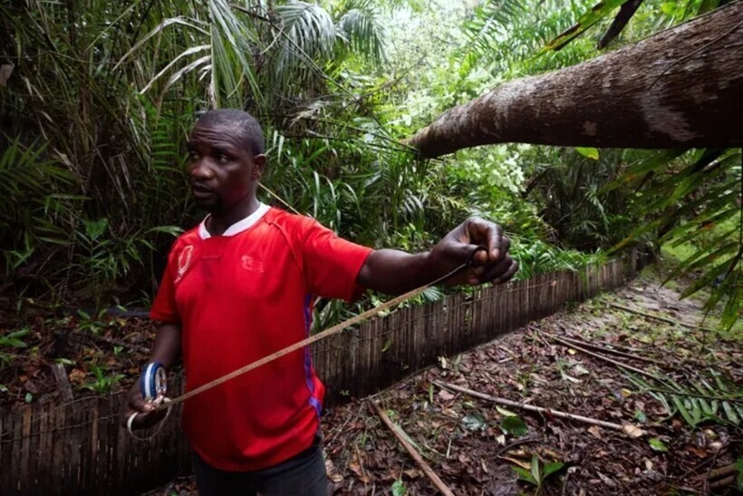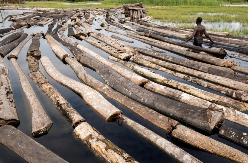 Эгбонтолуа Мариги, лесоруб, тянет бревно через затопленную лесную подстилку