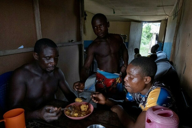 Дровосеки собираются после рабочего дня, чтобы разделить трапезу из риса и куколок жуков, которых они собрали в лесу