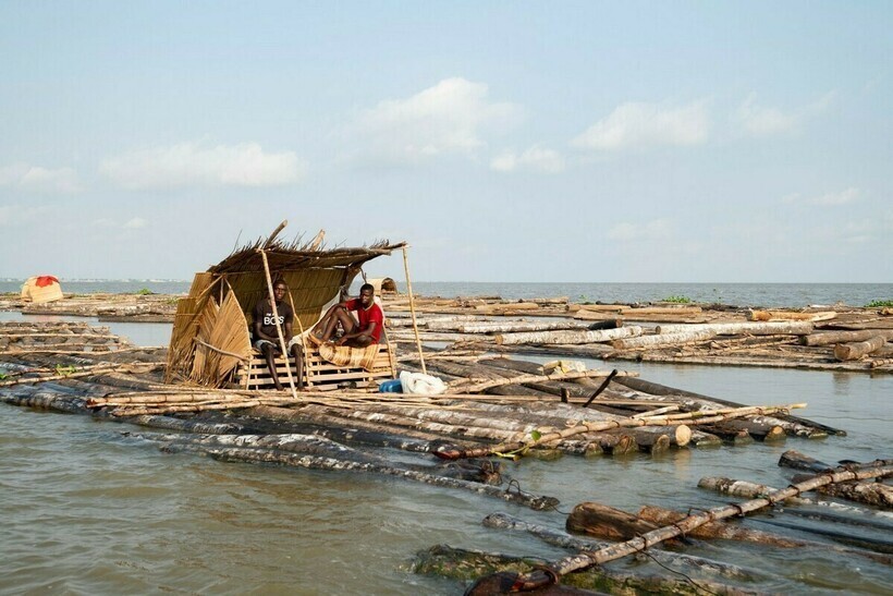 Лесорубы сидят в укрытии, построенном на плавучих плотах из бревен, которые перевозят в Лагос
