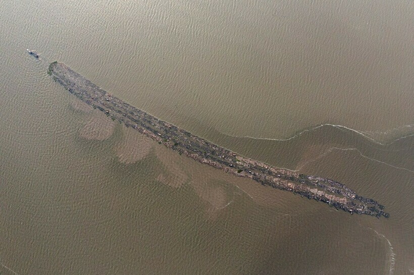 Буксир тянет линию бревенчатых плотов в Лагосе