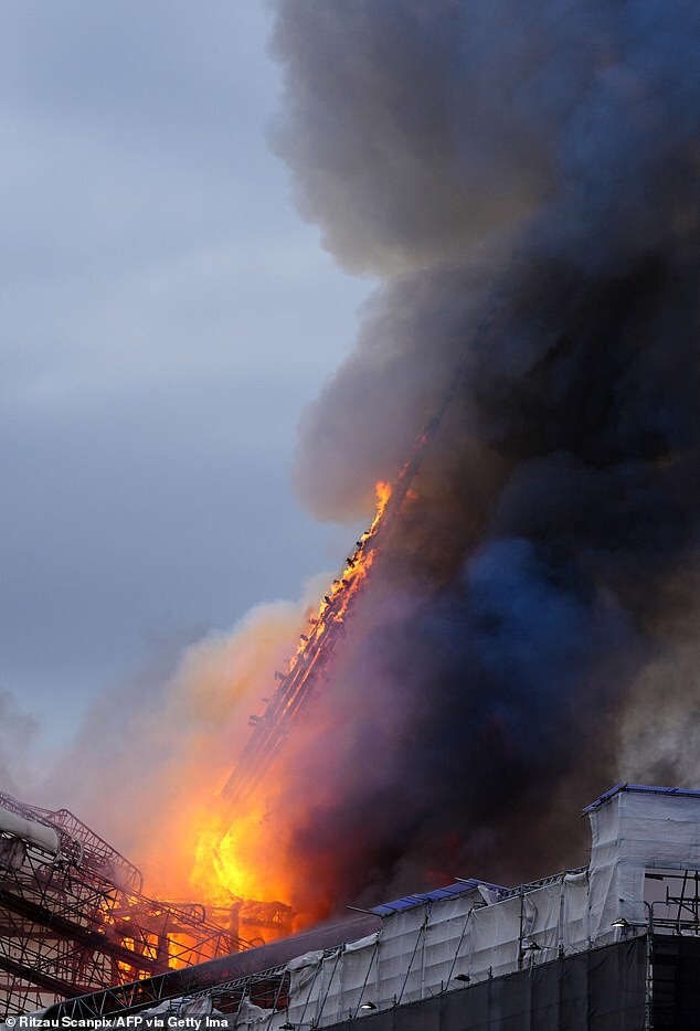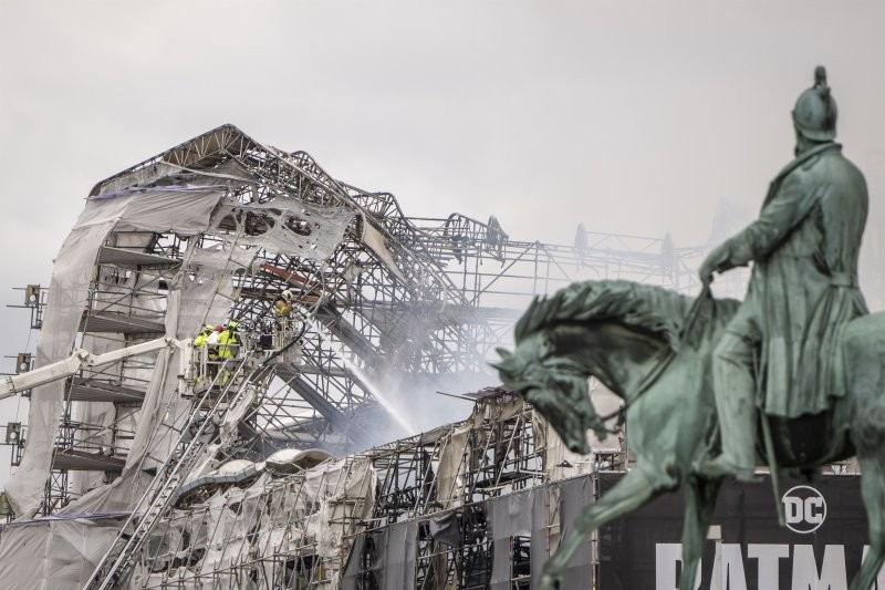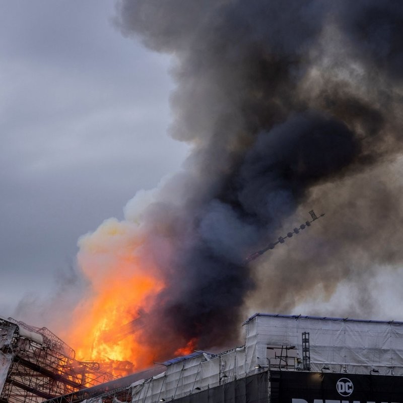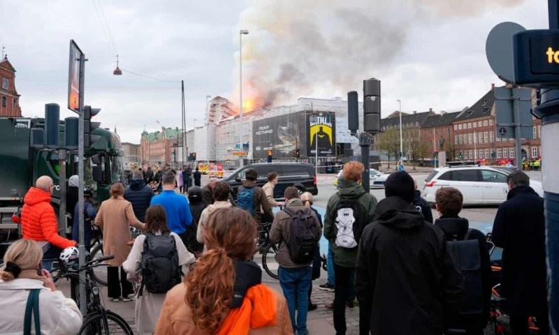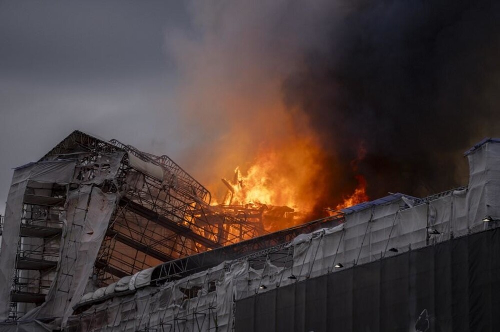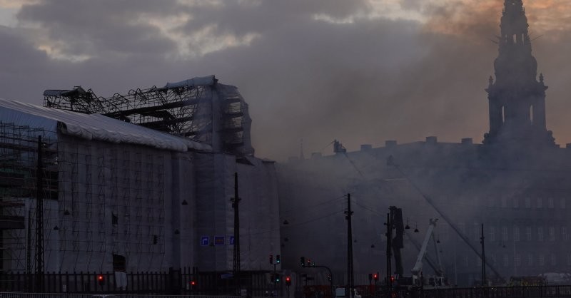 Во время реконструкции вспыхнуло одно из старейших зданий Копенгагена. Ранним утром 16 апреля раздался "сильный взрыв", языки пламени охватили фондовую биржу Бёрсен. Местные жители не смогли сдержать слёз, когда рухнул 56-метровый шпиль в виде сплетённых хвостов драконов.