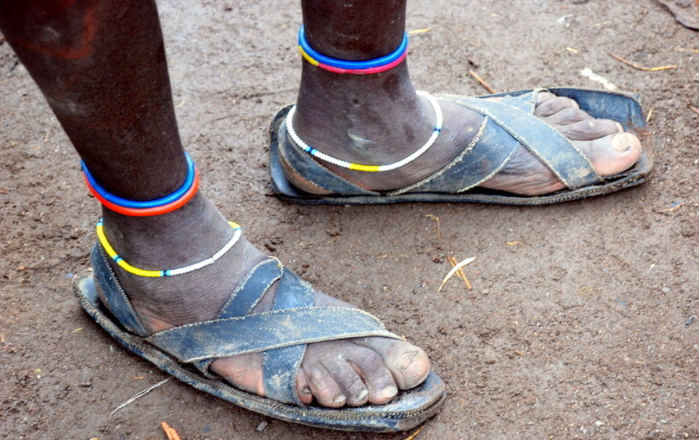 На ногах масаи приспособились носить вот такие самодельные тапки из старых автомобильных покрышек. Да - символ бедности. Но сносу нет, будем честны. Что еще в саванне кочевнику нужно-то?