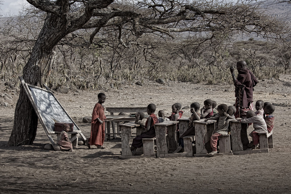 В каждой масайской деревушке можно отыскать особую площадку с импровизированными партами, отведенную под класс. Тут сидят рядочками 10-15 юных школяров, которым объясняет науки сердитый учитель.
