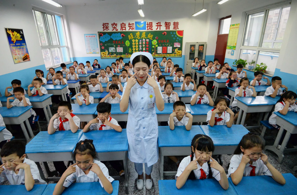 Медсестра учт детей делать зарядку для глас, чтоыб не болели от учебы. Снова оцените СКОЛЬКО тут детей