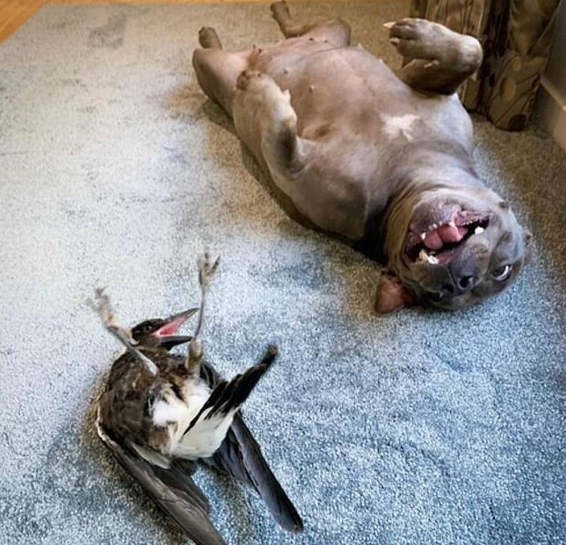 Пара спасла Молли в 2020 году, когда она была ещё птенцом, и начала рассказывать о её дружбе с двумя стаффами в соцсетях.