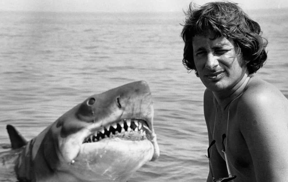 Стивен Спилберг дурачится во время съемок фильма "Челюсти"