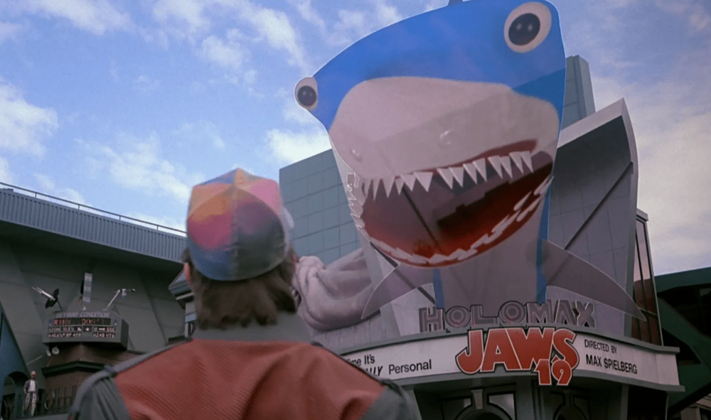 25. В фильме "Назад в будущее 2", когда Марти попадает в 2015 году, он пугается 3D-акулы. Все это происходит возле кинотеатра, где рекламируется фильм "Челюсти 19", режиссером которой является Макс Спилберг, намекая в шутливой форме на то, что в будущем сын Спилберга (да, у Спилберга есть сын Макс, который в то время был ребенком) снимет продолжение "Челюстей".