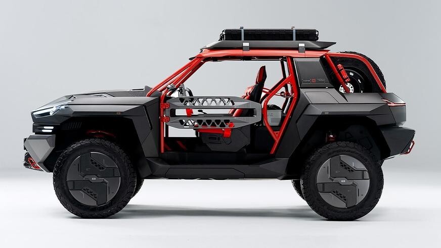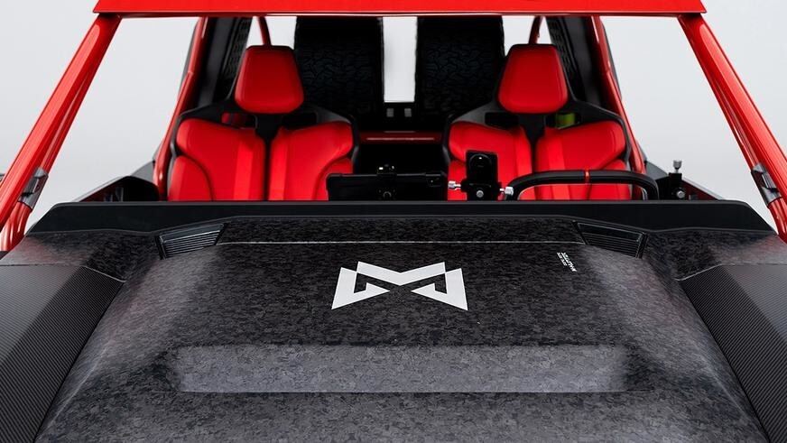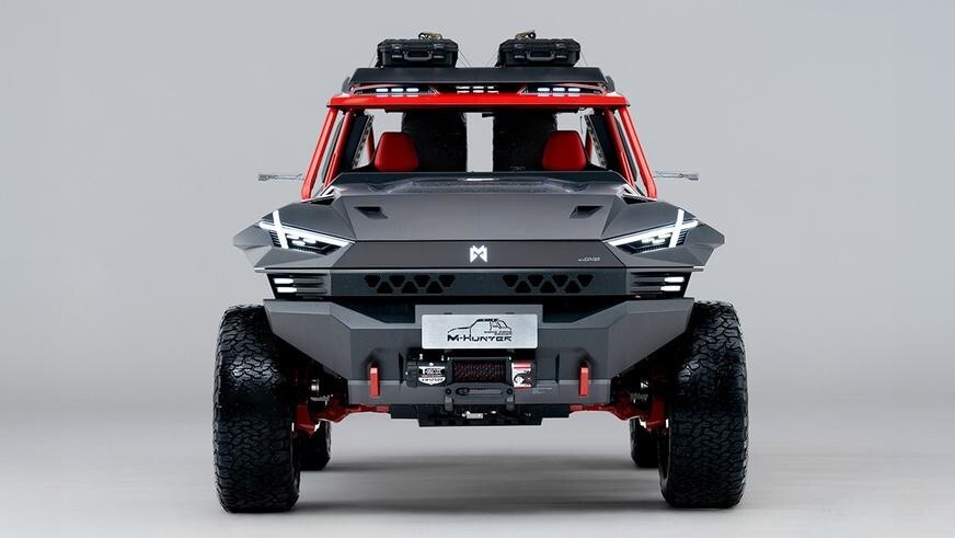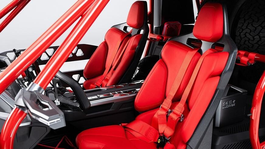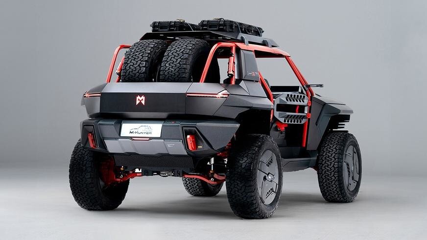 Насколько можно судить по фото, шасси Mengshi M-Hero в рамках проекта было доработано — M Hunter выглядит короче и выше донора. Кроме того, багги опирается на оригинальные колёсные диски. Ходы подвески также были увеличены — разработчики подчеркнули новые компоненты ходовой красными акцентами.