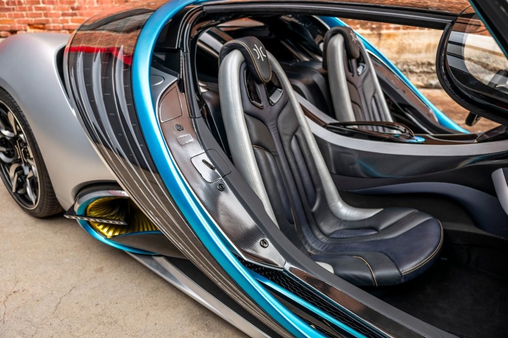 Как и купе на презентационных фотографиях 2022 года, автомобиль окрашен в матово-титановый оттенок с синими, чёрными и жёлтыми акцентами. Архитектура салона выставленного на продажу гиперкара также совпадает с той, которую получат серийные машины. Однако насколько функционально оборудование интерьера прототипа, аукционная площадка не уточняет.