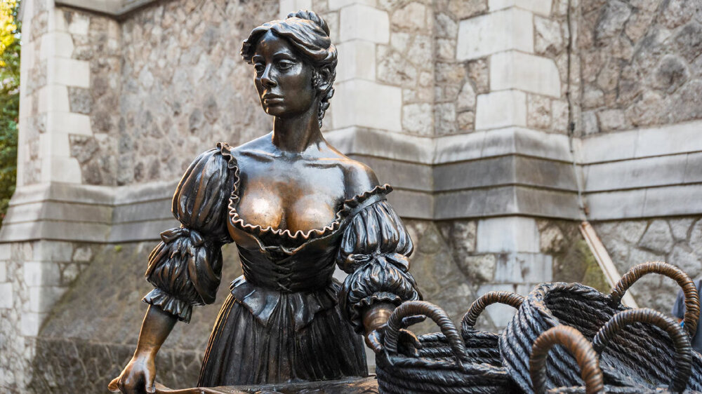 В Дублине есть очень популярный памятник молодой красавице Молли Малоун. Это – героиня жалобной народной песенки, торговка моллюсками и ракушками. Взгляд сразу привлекает её не особо скромный наряд и выделяющиеся цветные пятна. Область выреза и руки у неё кажутся золотыми – до того натерты.