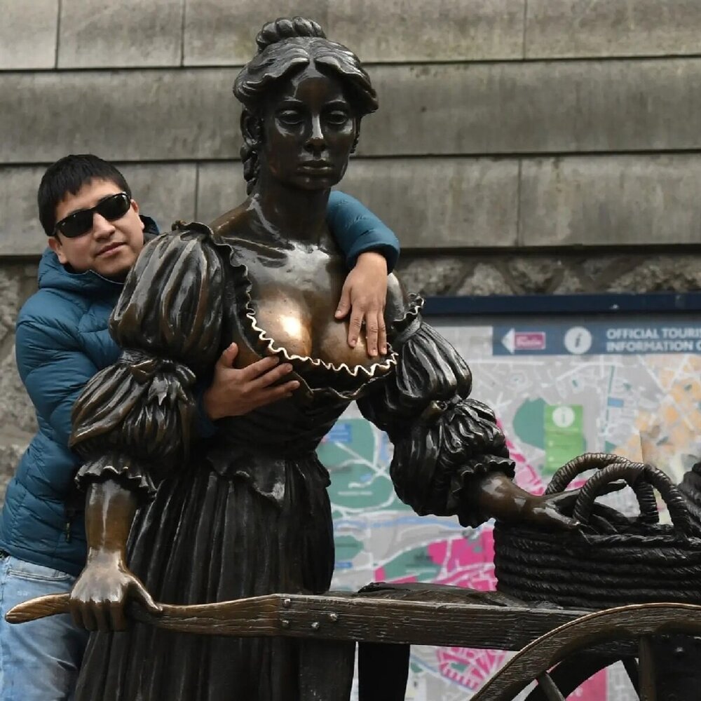 Многим ирландцам это всё не очень нравится. Даже проводили кампании с требованием оставить Молли в покое. Да разве туристов образумишь? К слову, по всему миру есть аналогичные памятники с натертыми местами. В Вероне залапана до блеска Джульетта – люди верят, что прикосновение к ней принесет счастье в любви. А посмотрите на статую любознательного соседа в Мадриде. Тоже трут на удачу.
