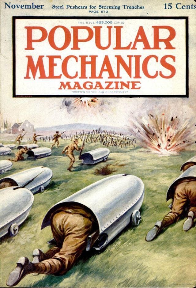 Пугающий рисунок футуристичной военной машины в журнале 1916 года