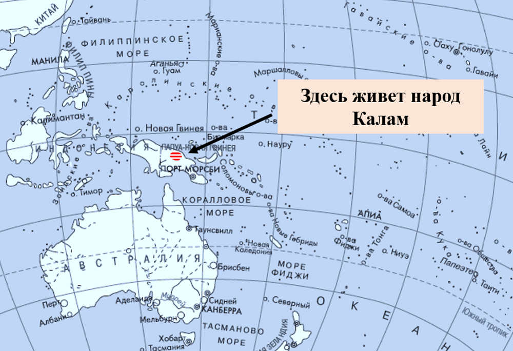 Остров поделен между двумя государствами: восточная часть принадлежит Индонезии, а западная — Папуа - Новая Гвинея. Представители народа калам являются гражданами Папуа - Новая Гвинея. Но это так думают власти страны. Каламы же так не думают. Они сами по себе. Им чужды паспорта и деньги.