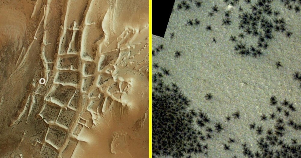 Каждую весну на Марсе появляются жуткие "пауки". Арахнофобам не стоит бояться: новая фотография Европейского космического агентства на самом деле демонстрирует сезонный выброс углекислого газа на Красной планете.
