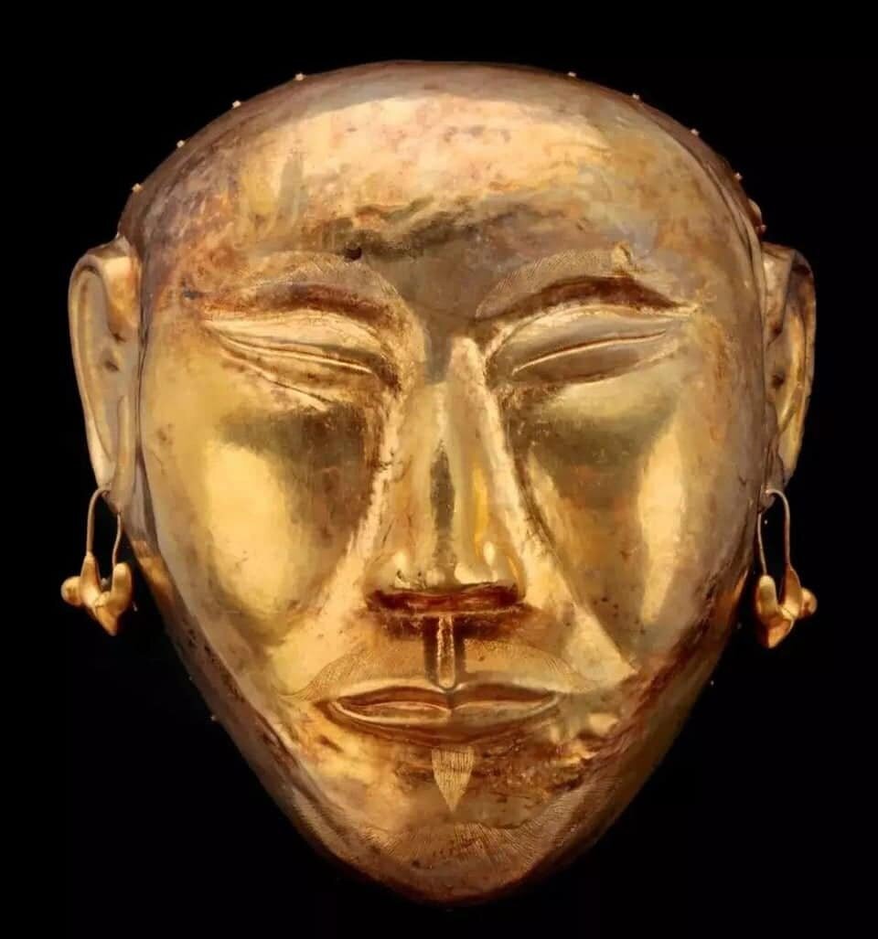 Золотая погребальная маска с серьгами, Монголия или Северный Китай, династия Ляо, 916–1125 годы нашей эры