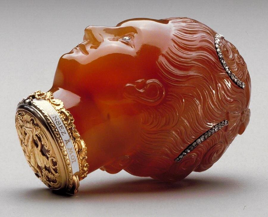 Агатовая мужская табакерка в форме женской головы. Подарок по заказу дамы своему возлюбленному, 18 век