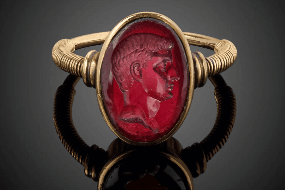 Древнее кольцо с гранатом, которое, вероятно, изображает первого римского императора, 20 год до нашей эры