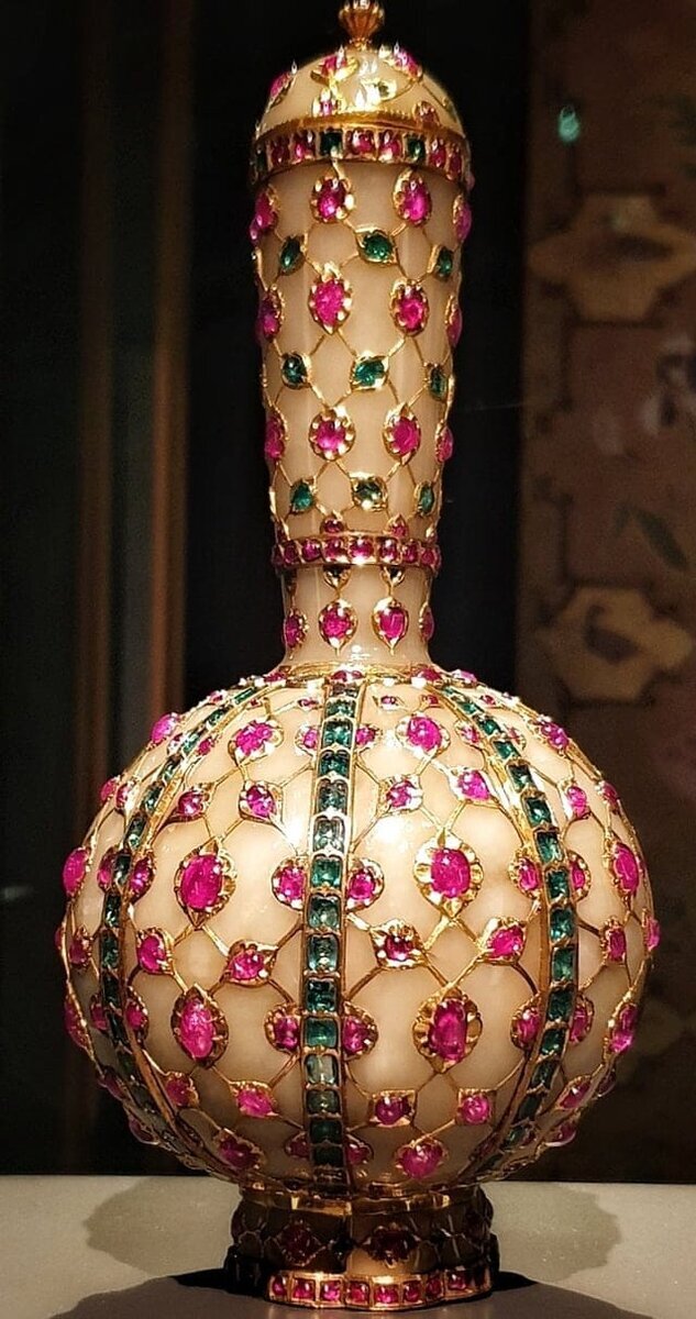 Фляга Великих Моголов 17 века из нефрита и золота, украшенная изумрудами и рубинами