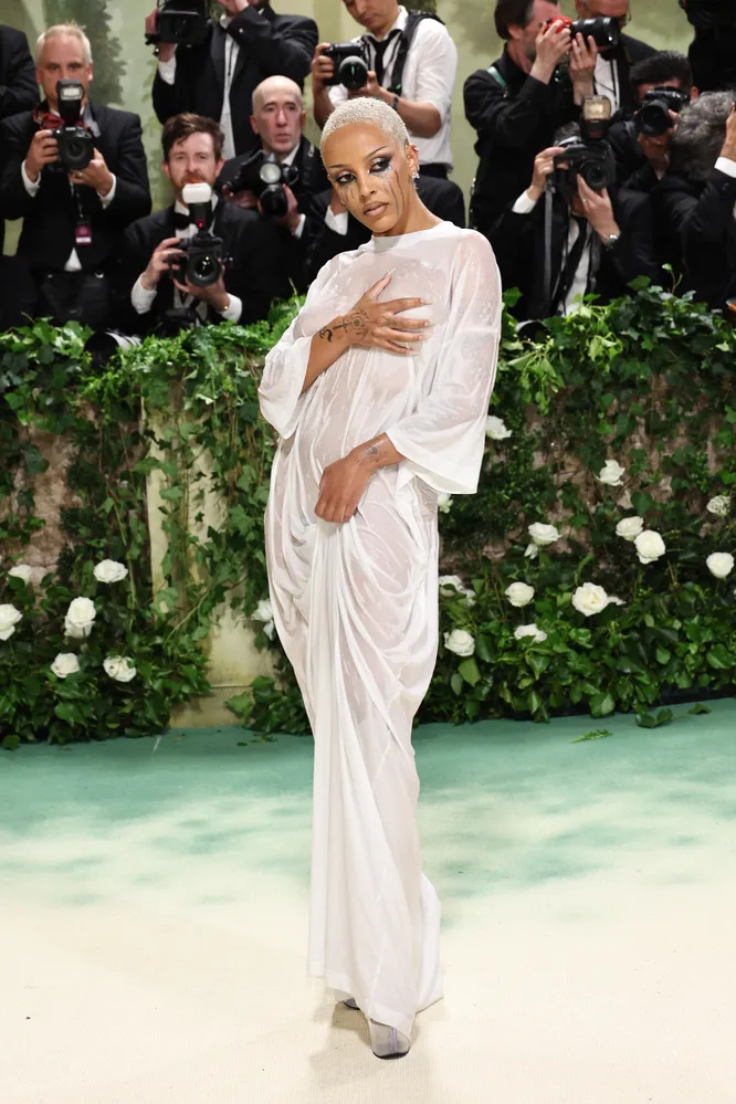 Доджа не может не эпатировать. В этом году она посетила мероприятие в мокром белом платье-футболке. Несмотря на противоречивость образа, исполнительница выглядела в нём совершенно непринуждённо.