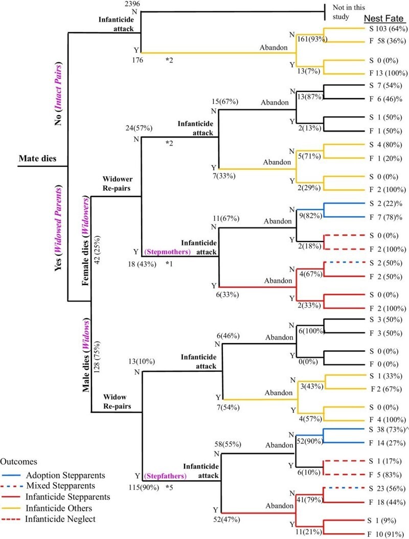 Биологи выяснили, что нападению также подверглось гнездо, в котором умер один из родителей. Второму защитить и прокормить свой выводок становилось труднее. Порой попугайчики после смерти партнера находили новых партнеров, и те, в свою очередь, заклевывали до смерти оставшееся потомство. Таким образом, в рамках одного вида и системы спаривания детоубийство происходило в нескольких контекстах из-за множества факторов. Тем не менее 48% приемных родителей обоего пола усыновили потомство, а еще 23% "отчимов" избавлялись от чужих птенцов.