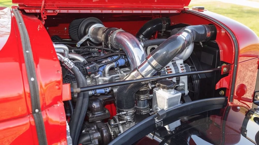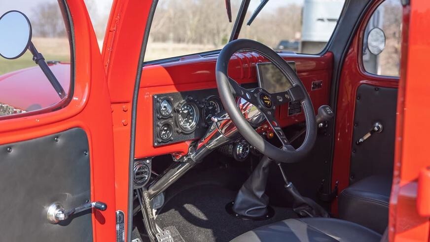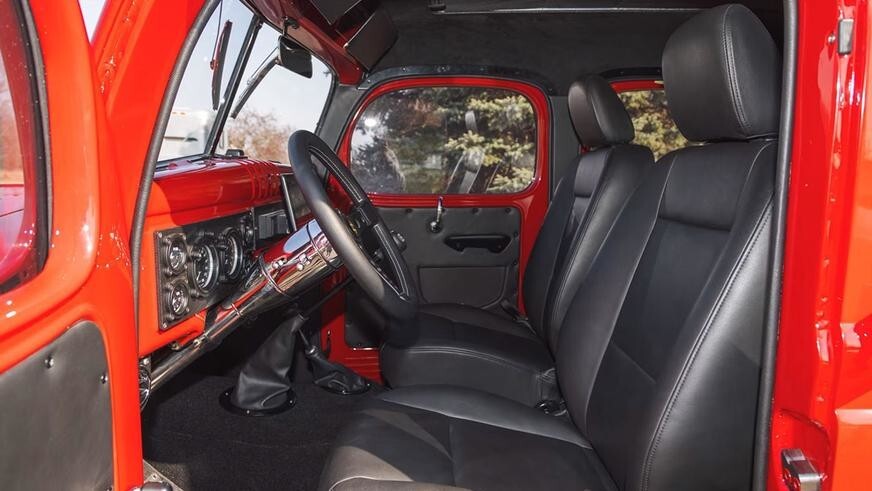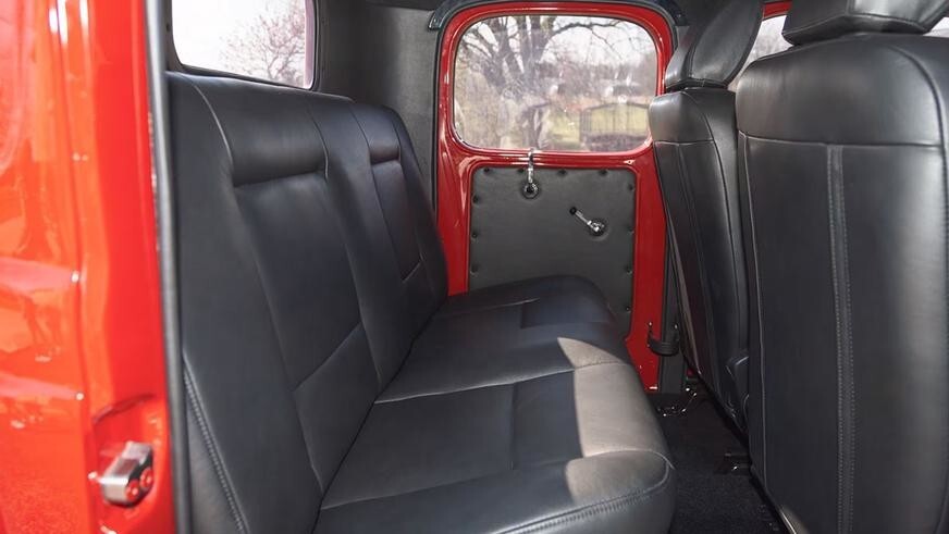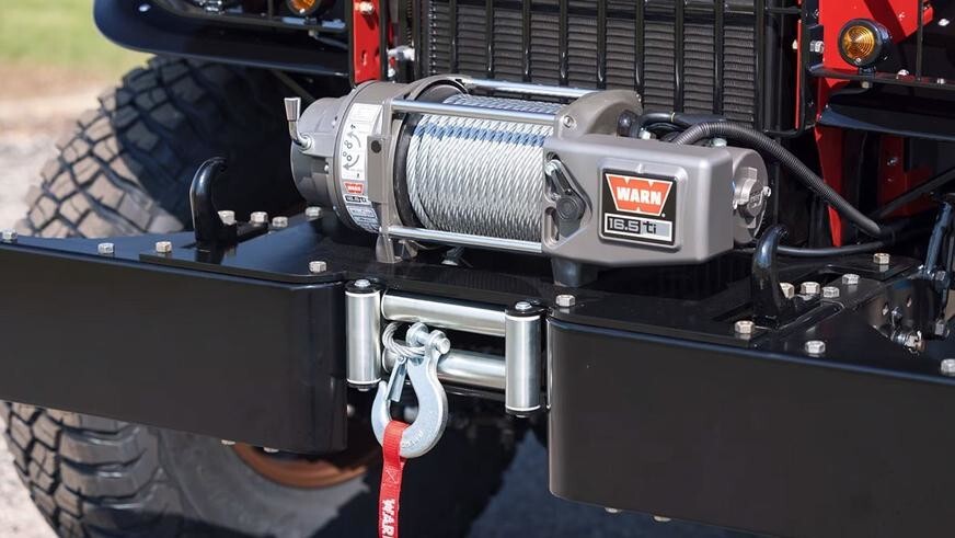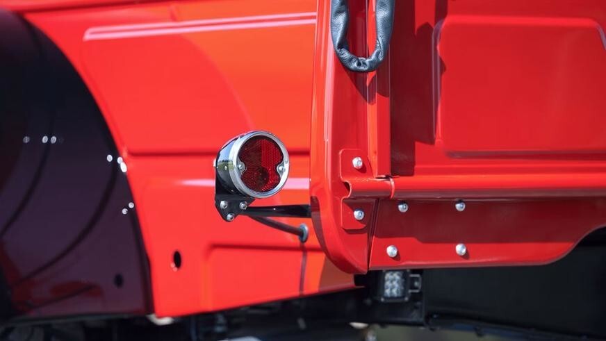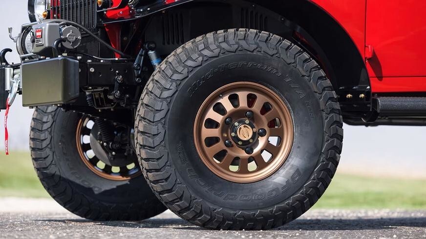 Доработки не ограничились кабиной. Под капотом находится современный 2.8-литровый 4-цилиндровый турбодизель Cummins, агрегатированный с 5-ступенчатой механикой Tremec. Ходовка обогатилась регулируемыми амортизаторами Bilstein, а вместо старых барабанных установлены дисковые тормоза на всех колёсах. В грузовом отсеке уложен водостойкий настил из дерева, тяговое усилие лебёдки Warn в переднем бампере составляет 7.5 тонны. Всё это великолепие цвета пожарной машины обуто в гигантские 39-дюймовые шины BFGoodrich.