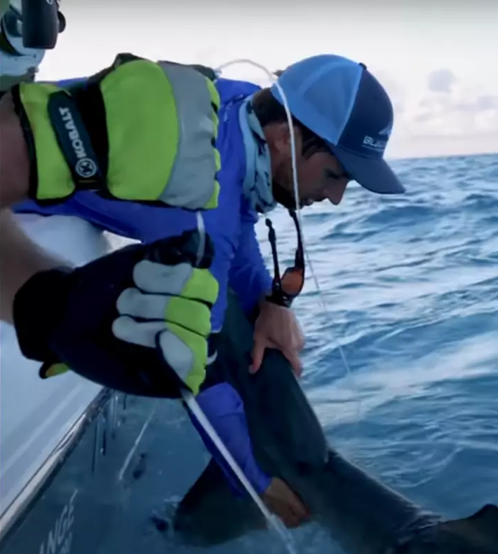Джош поймал на крючок рифовую акулу, но заглянув в воду, рыболов увидел, что его улов поедает гораздо более крупная тигровая акула. По словам рыбака, это была самая большая акула, которую он когда-либо ловил! После непростой борьбы с огромной хищницей, ему всё же удалось закинуть рыбу в лодку. Но не ради вылова - он хотел вытащить крючок из её пасти. Они с рыбаками измерили акулу: её длина составила 4,3 метра, а вес - 450 кг. Это довольно крупная особь.