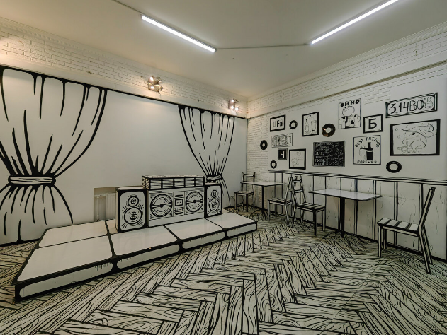 Это черно-белое кафе из питера. Повторили, но не поймали духа кафетерия. Нет ощущения, что ты в мультике. Просто в черно-белом помещении