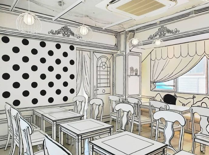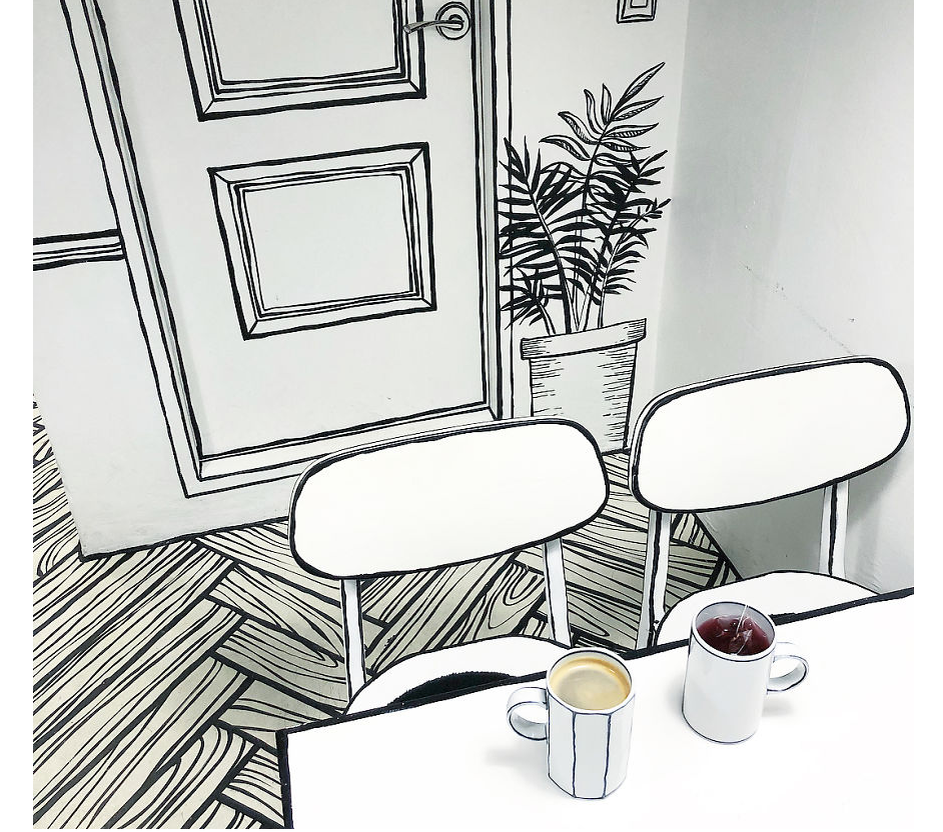 Быть может, вы видели такие фотографии сюрреалистичных кафе. Они — словно нарисованные кадры из мультфильма – с жирными, порой неровными линиями «от руки». Это популярный последние лет 6 тренд – черно-белых кафе, самое известное из которых, пожалуй, Cafe Yeonnam-dong 239-20 в Южной Корее.