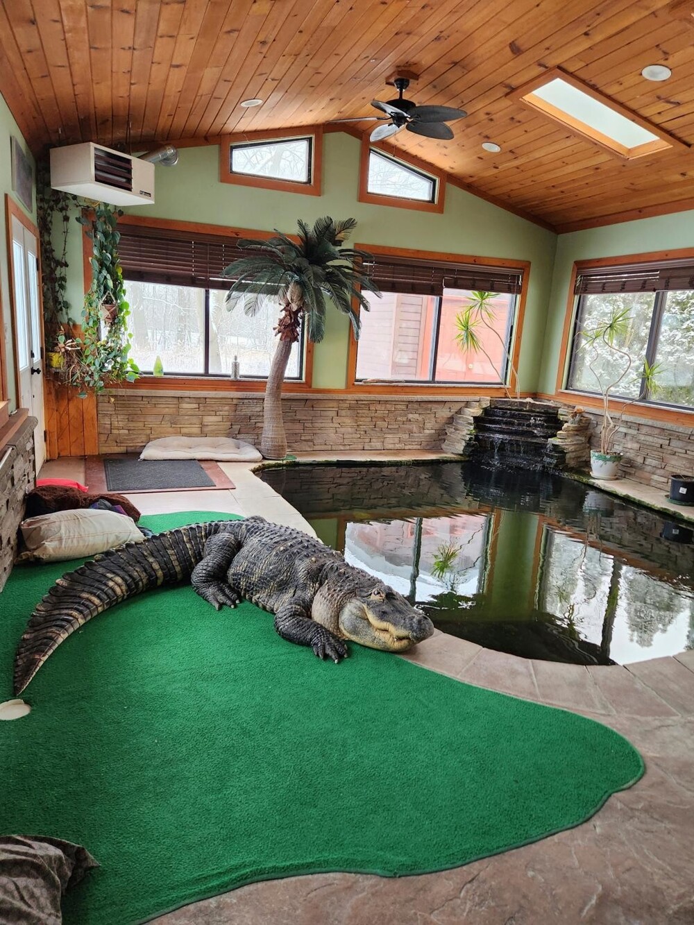 В настоящее время аллигатор находится в огороженном вольере, изготовленном по индивидуальному заказу, и за животным можно наблюдать издалека.