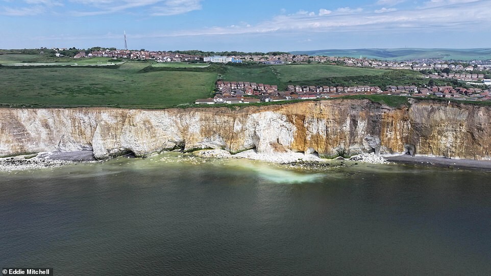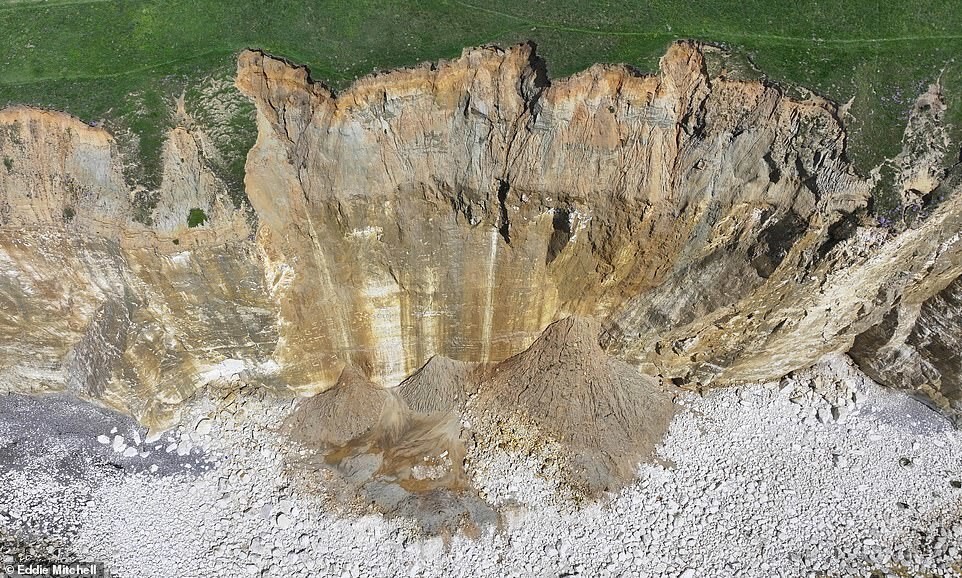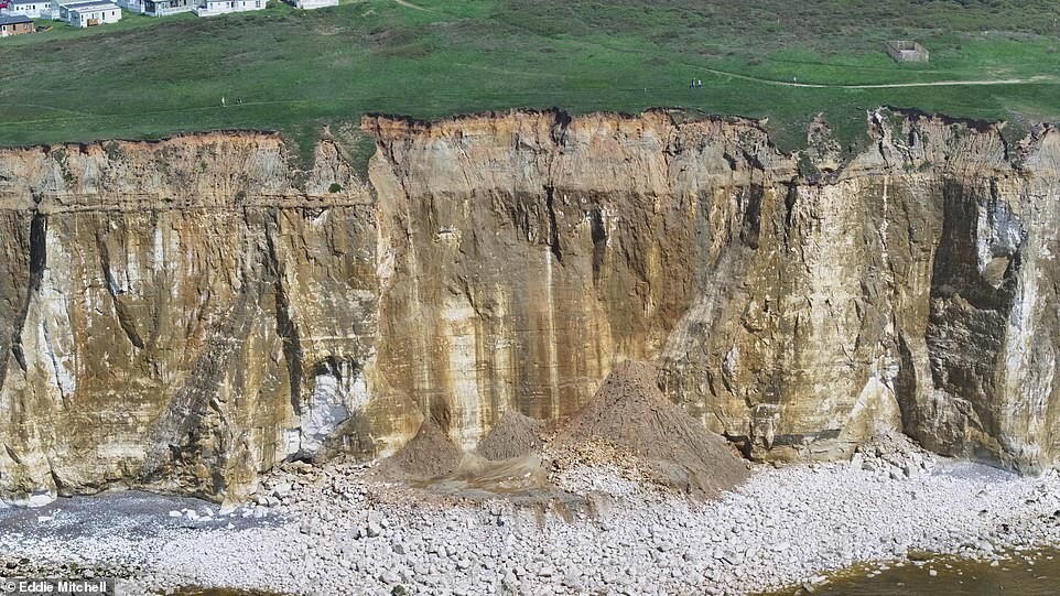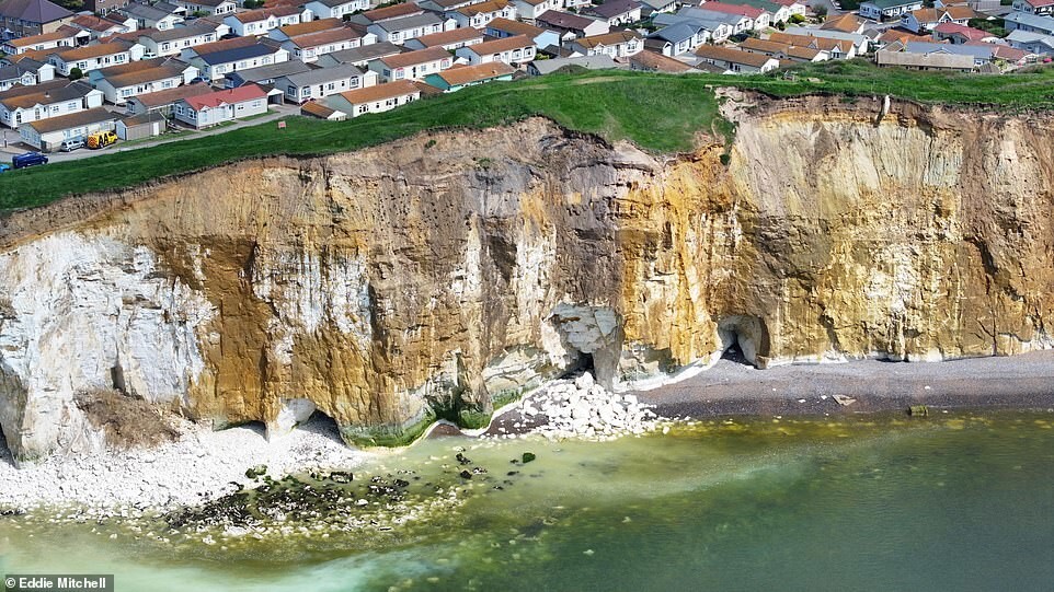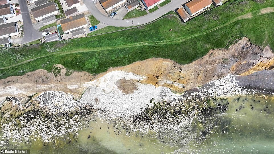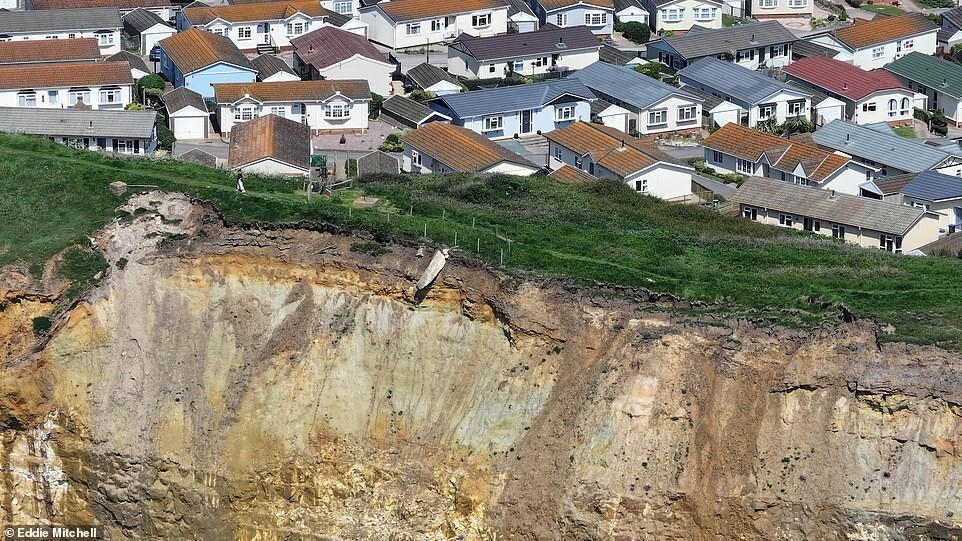 На опубликованных в сети аэроснимках показано, что передвижные дома стоят на опасном расстоянии от края скалы, а люди продолжают ходить по побережью.