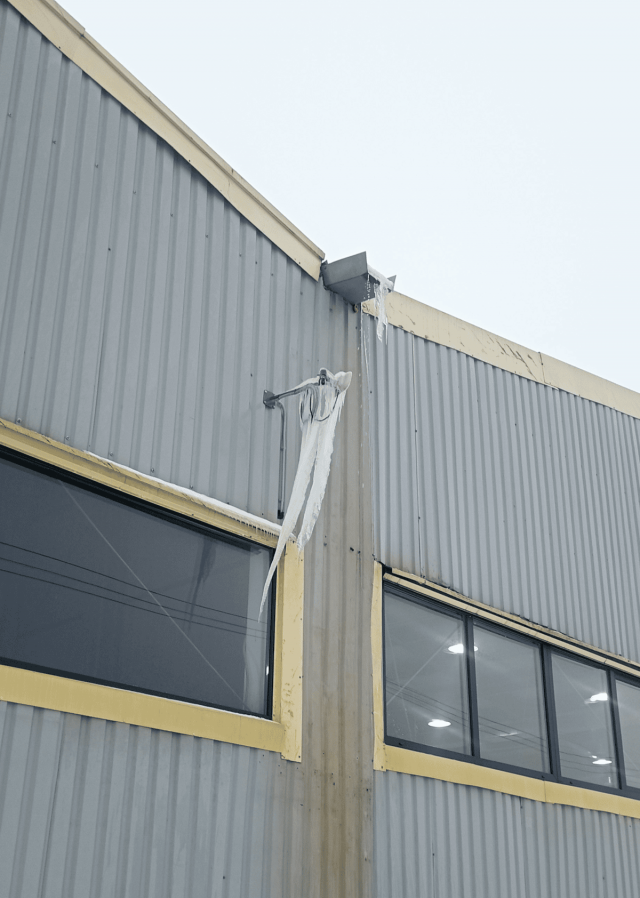 Камера видеонаблюдения, расположенная прямо под сливным желобом на крыше