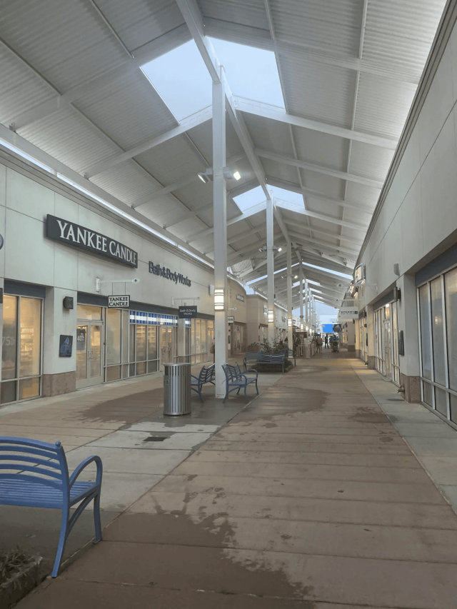 В торговом центре потолки есть везде, за исключением места, где стоят скамейки