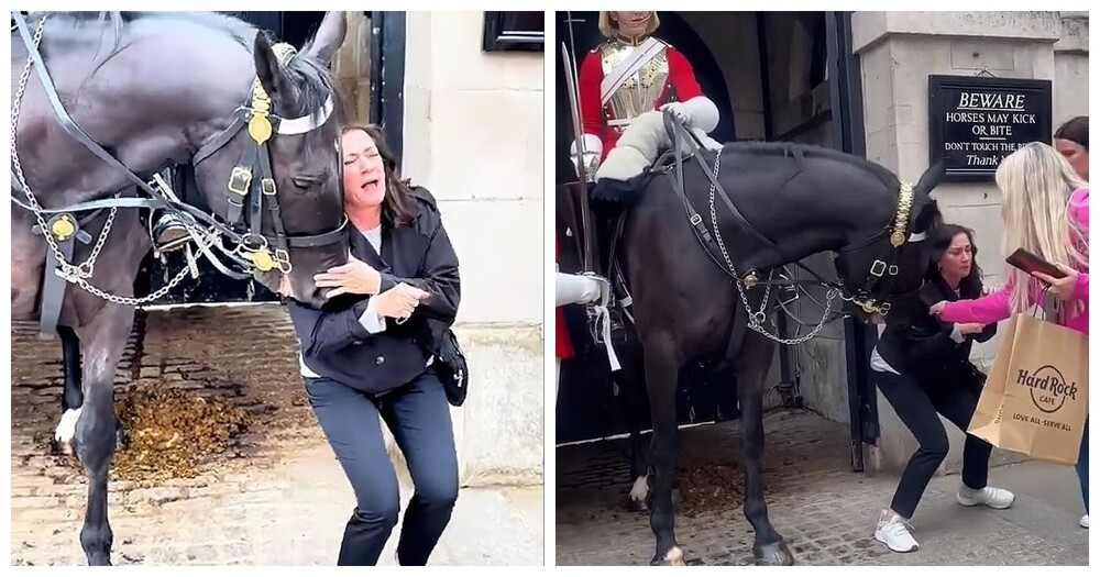 Ни королевский гвардеец в седле, ни второй солдат, стоящий рядом, никак не реагируют на ситуацию. В итоге на помощь несчастной пришли другие туристы, стоявшие рядом. Они ласково похлопали лошадь по носу, чтобы она ослабила хватку.