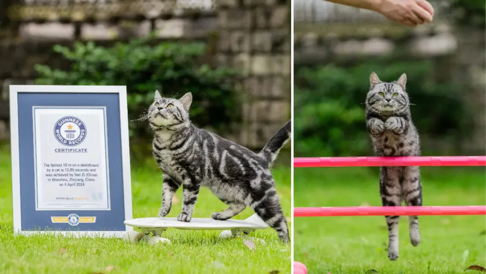 Китайский кот установил мировой рекорд по скорости езды на скейтборде (3 фото + 1 видео)