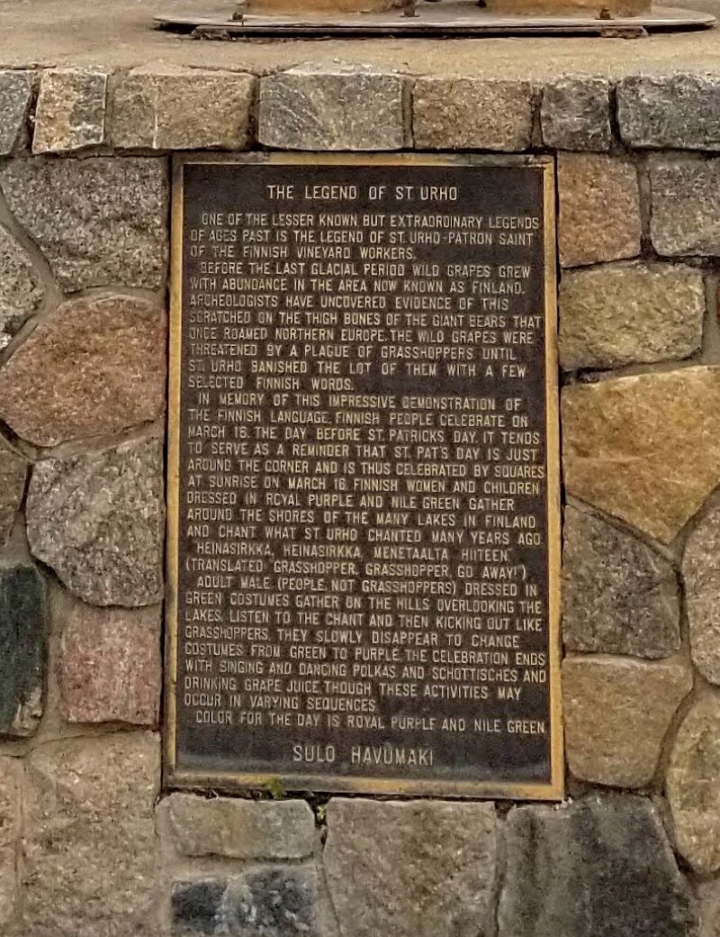 Так или иначе, самая известная скульптура с изображением Святого Урхо и табличкой с самой легендой находится в Миннесоте, в городе Менахга (Menahga).