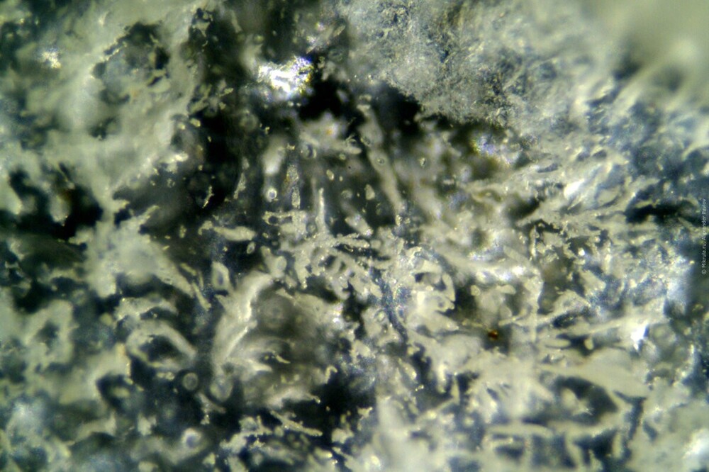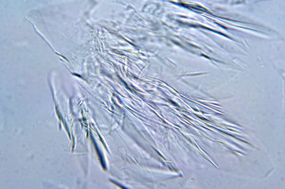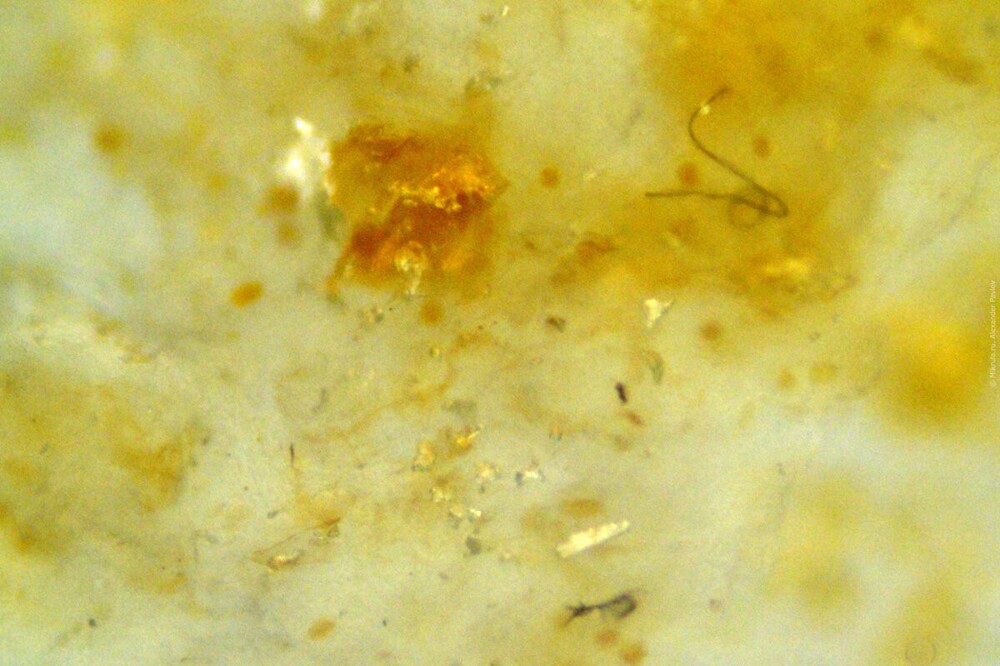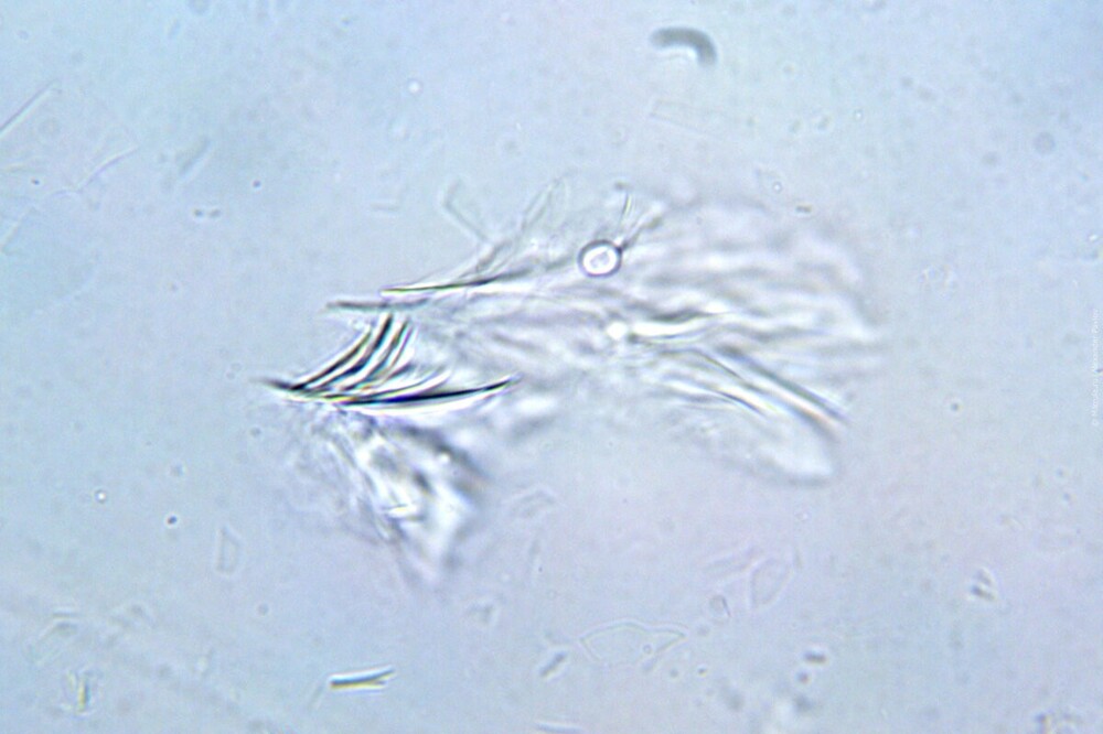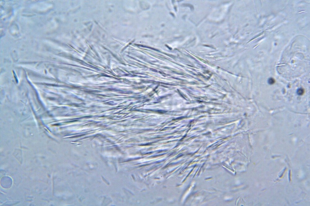 Ну, а что же с самим мёдом? Вот проба труда заморских пчёл, в которой мы видим характерные пластинки кристаллизовавшихся сахаров.