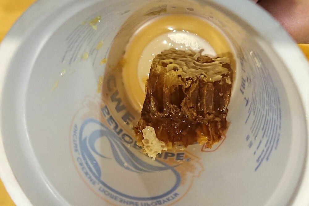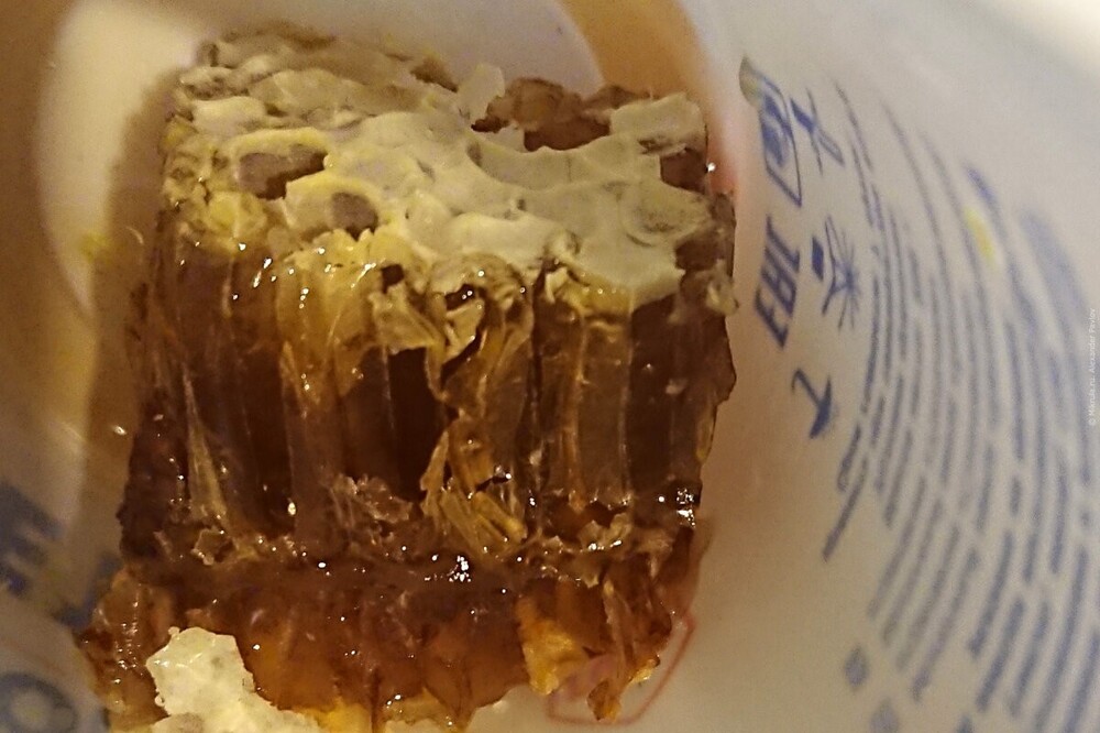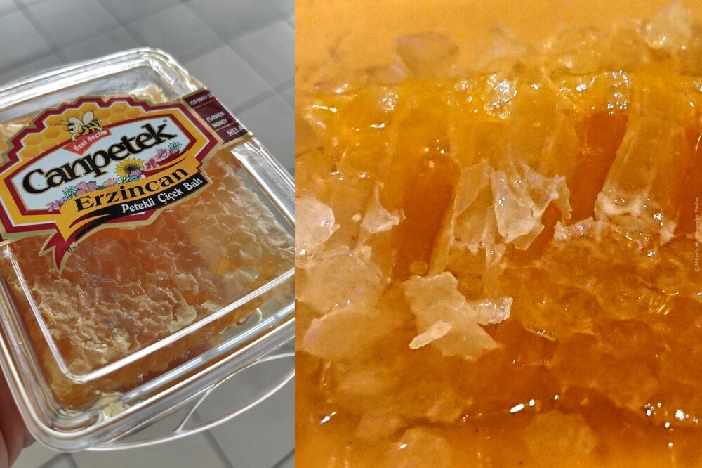 Ещё одна особенность турецкого мёда — крышки сот часто отваливаются от каждой соты в отдельности (см. фото ниже, слева). На дне коробки с мёдом множество отдельных шестиугольных крышек. Если попытаться снять крышку с местных сот, она, скорее всего, оторвётся большим куском (см. фото ниже, справа).