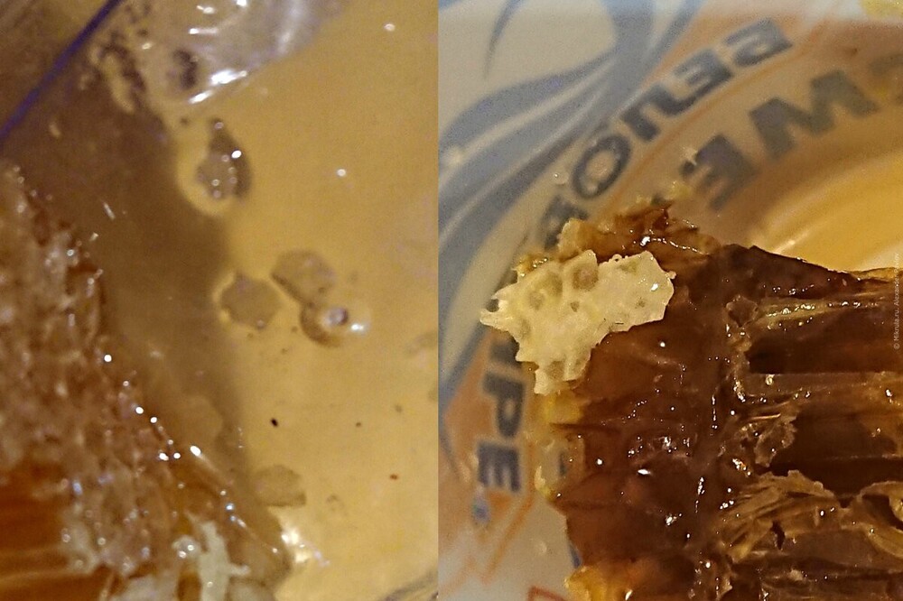 Первое, что бросается в глаза, стенки в сотах продукта из турции подозрительно однообразны. Создаётся впечатление, что они сделаны из стекла или пластика.