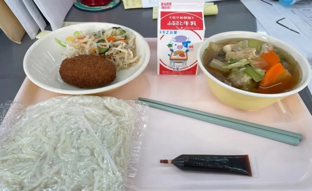 Тарелка овощного супа на первое, котлета, салат и лапша с соевым соусом на второе, и молоко на десерт — отличный сбалансированный обед.