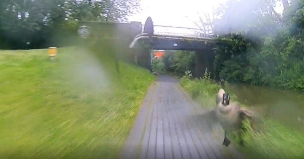 Камера Go-Pro запечатлела, как лапчатый пролетел над головой мужчины и сбил его с велосипеда. Британец поделился роликом, сопроводив его подписью: "Гусь выбрал насилие".