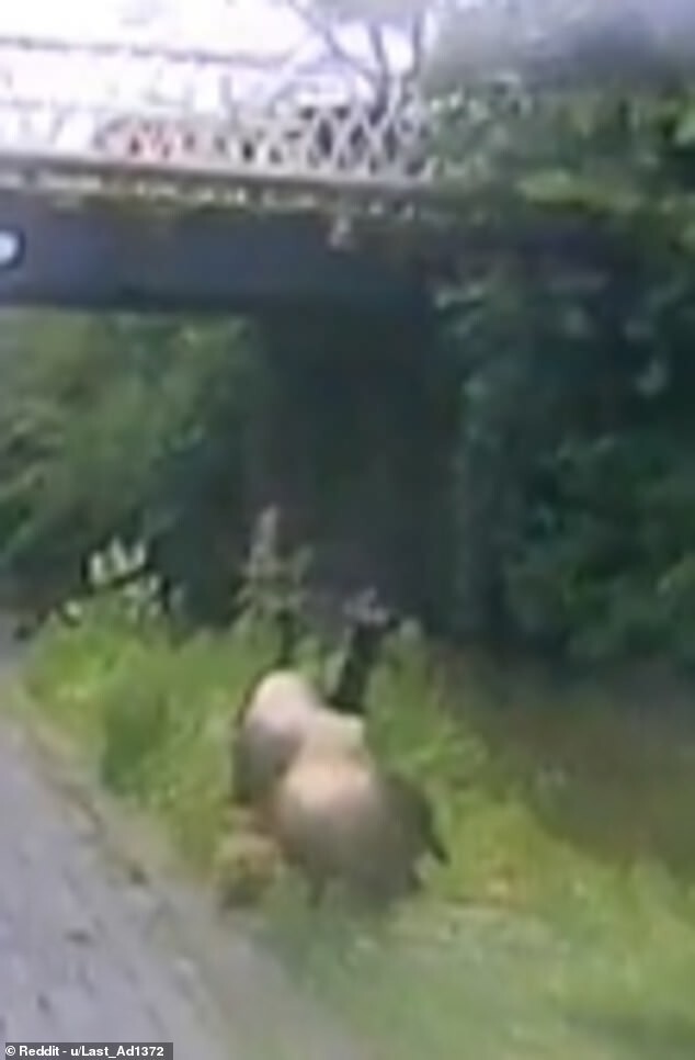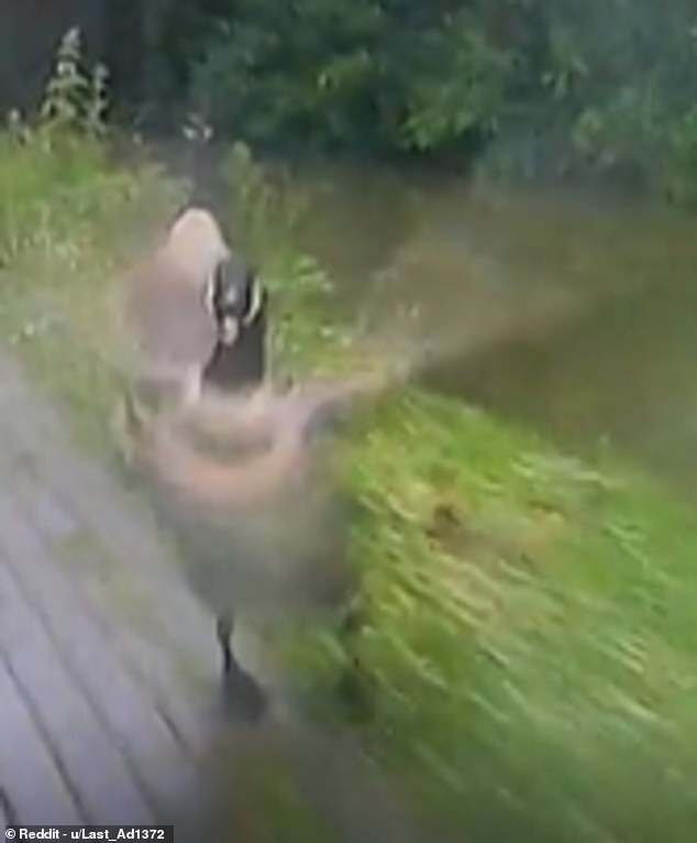 Он притормозил, когда приблизился к утке и паре гусей на берегу. Когда мужчина попытался объехать птиц, гусь бросился на него. Человек оказался на земле, а лапчатый продолжал устрашающе размахивать крыльями.