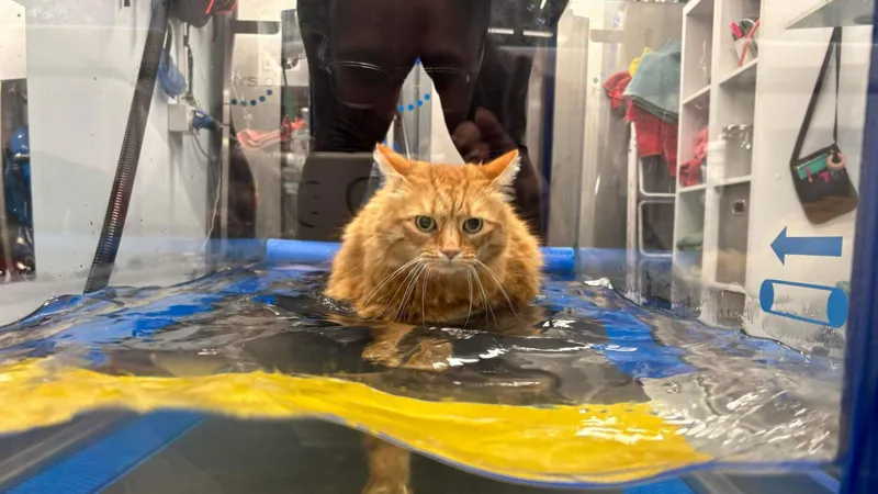Чтобы помочь домашнему животному похудеть, ветеринары решили приучить его к специальной беговой дорожке для животных, установленной в резервуаре с водой.