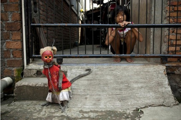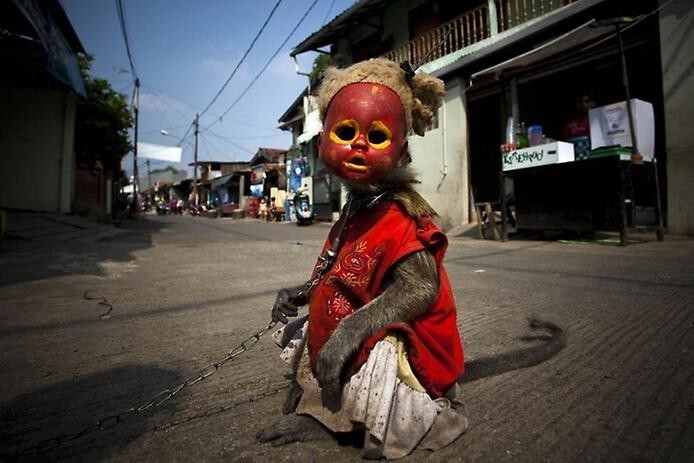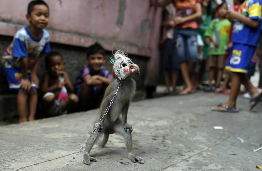 Правительство иногда ловит этих обезьянок и забирает. Все потому что дрессируют их жестко, садят в тесные клетки, корма тоже дорогого им не видать, владельцам самим есть нечего. Их держат на короткой цепи, чтобы те переучились ходить с четырех ног на двух. В большом мегаполисе это считается жестоким обращением с животными, их надо спасти.