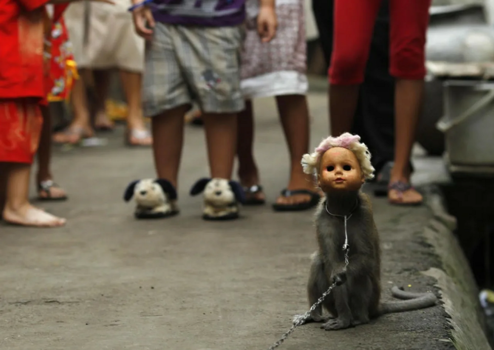 Потому что попрошайками тут работают обезьянки, наряженные в детские платья… и с масками от кукол на лице! Неживыми лицами больших пупсов, ведь лицо барби на обезьянку не налезет.