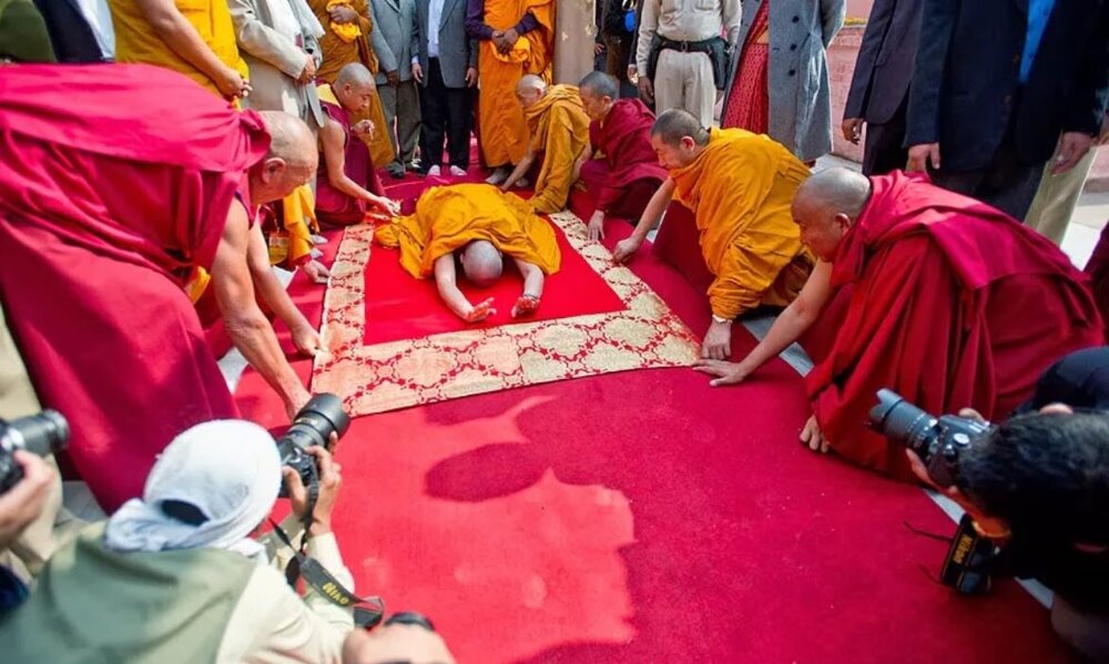 Он уделял большое внимание практике простирания и совершил их около 3,5 млн. Лама Цонкапа разодрал руки, ноги, колени в кровь, оставив отпечаток своего тела на полу храма. Теперь это место поклонения буддистов всего мира.