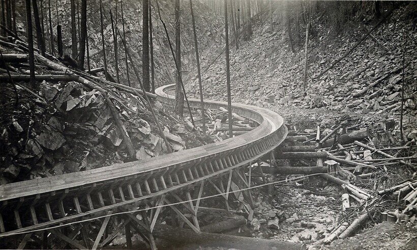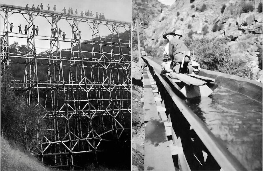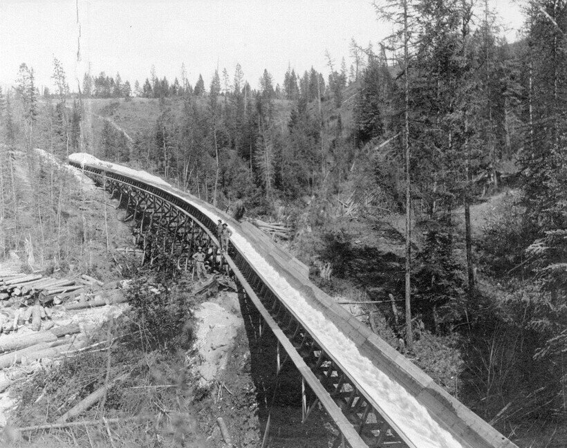 Эти каналы представляли собой неглубокий желоб, по которому с помощью воды к фабрикам спускались пиломатериалы. Некоторые из этих сооружений выглядели поразительно: они на многие километры протягивались над пропастями и склонами, а в высоту иногда достигали нескольких метров. Каналы прокладывали в таких участках, куда было бы слишком сложно добраться на лошадях. Так желоб стал дешевой альтернативой для транспортировки древесины.