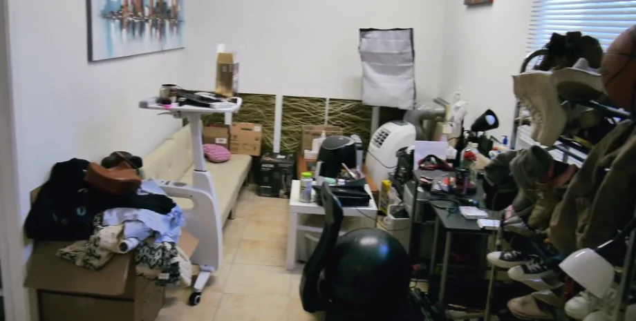 Гараж был переоборудован в крошечный дом, в котором есть ванная комната, спальня, гостиная и кухня. Пространство довольно тесное, все поверхности завалены коробками и сумками.